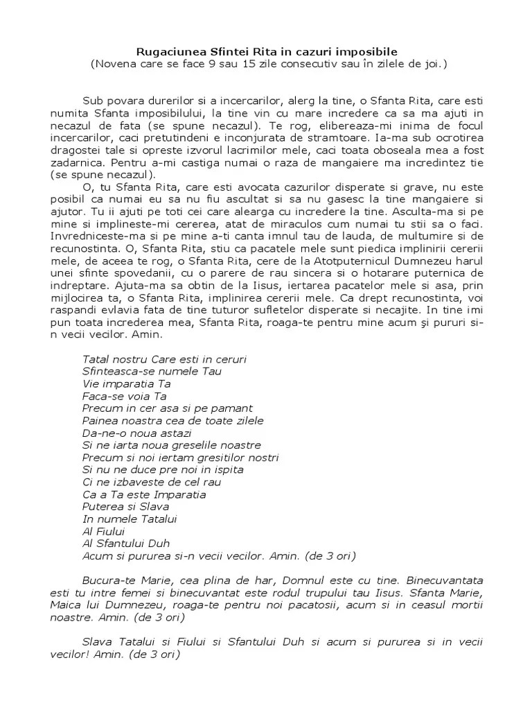 Sub povara durerilor şi a încercărilor, alerg la tine,. Se citește 9 joi consecutiv sau 9 zile la rând! Cununa de rugăciuni începe în prima joi din luna februarie. 22.05.2016 · rugăciunea sfintei rita în cazuri imposibile. Cu toții avem nevoie de o minune în viața noastră, iar pentru asta trebuie neîncetat să ne rugăm. Cu toții avem nevoie de o minune în viața noastră, iar pentru asta trebuie neîncetat să ne rugăm. (sfânta făcătoare de minuni imposibile 22 mai) novenă care se face 9 sau 15 zile consecutiv sau în zilele de joi. "o, sfântă apărătoare a celor aflați la... "o, sfântă apărătoare a celor aflați la.