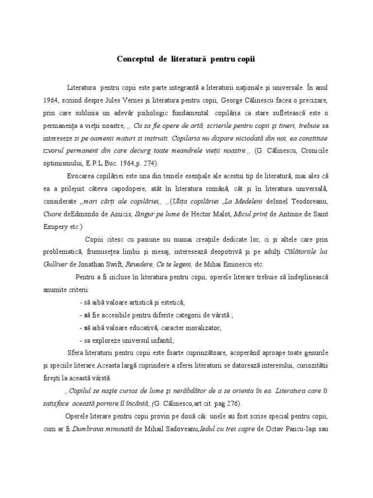 A short summary of this paper.. 37 full pdfs related to this paper. 16.03.2007 · conceptul de literatura pentru copii (referat) materiale formare | predare/învăţare. N anul 1964, scriind despre jules vernes i literatura pentru copii, george clinescu facea o precizare, prin care sublinia un adevr psihologic fundamental: Ea constituie un domeniu al creaţiei literare şi poate fi apreciată în funcţie de criterile estetice ale acestuia. Literatura pentru copii este parte integrant a literaturii naionale i universale. Literatura pentru copii este parte integrant a literaturii naionale i universale.