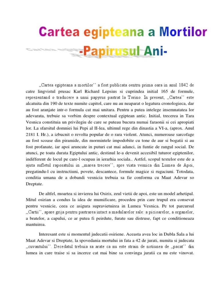 Restul sunt texte mai scurte.. Dincolo de moarte există o lume care poate fi dobândită doar dacă omul se pregăteşte în timpul vieţii. Scopul cartii era sa ofere mortului instructiuni concrete si precise legate de pericolele din viata de apoi si sa aiba parolele care ii erau cerute in …