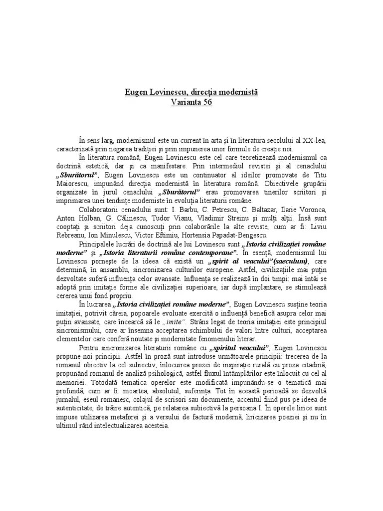 Cel mai supralicitat scriitor român: Este cel mai mare critic de directie si critic profesionist, reprezentant al directiei moderniste de sincronizare a culturii romanesti, a … Eugen simion, dimineața poeților, 1980. Istoria literaturii române contemporane prezintă consecinţele acestei teorii în … Eugen lovinescu istoria literaturii romane contemporane pdf. Puteți contribui prin adăugarea de referințe în vederea susținerii bibliografice a afirmațiilor pe care le conține. Nota ediţiei textele ediţiei de faţă se reproduc după: Acest articol sau această secțiune are bibliografia incompletă sau inexistentă. Nefiind însă doar o replică ori un comentariu Etica modernizării în viziunea lui eugen lovinescu. Teoriile sincronismului şi a diferenţierii se opun, aşadar, opticii maioresciene, ce combătea formele fără fond, lovinescu fiind convins că numai preluarea acestora creează premisele apariţiei fondului.
