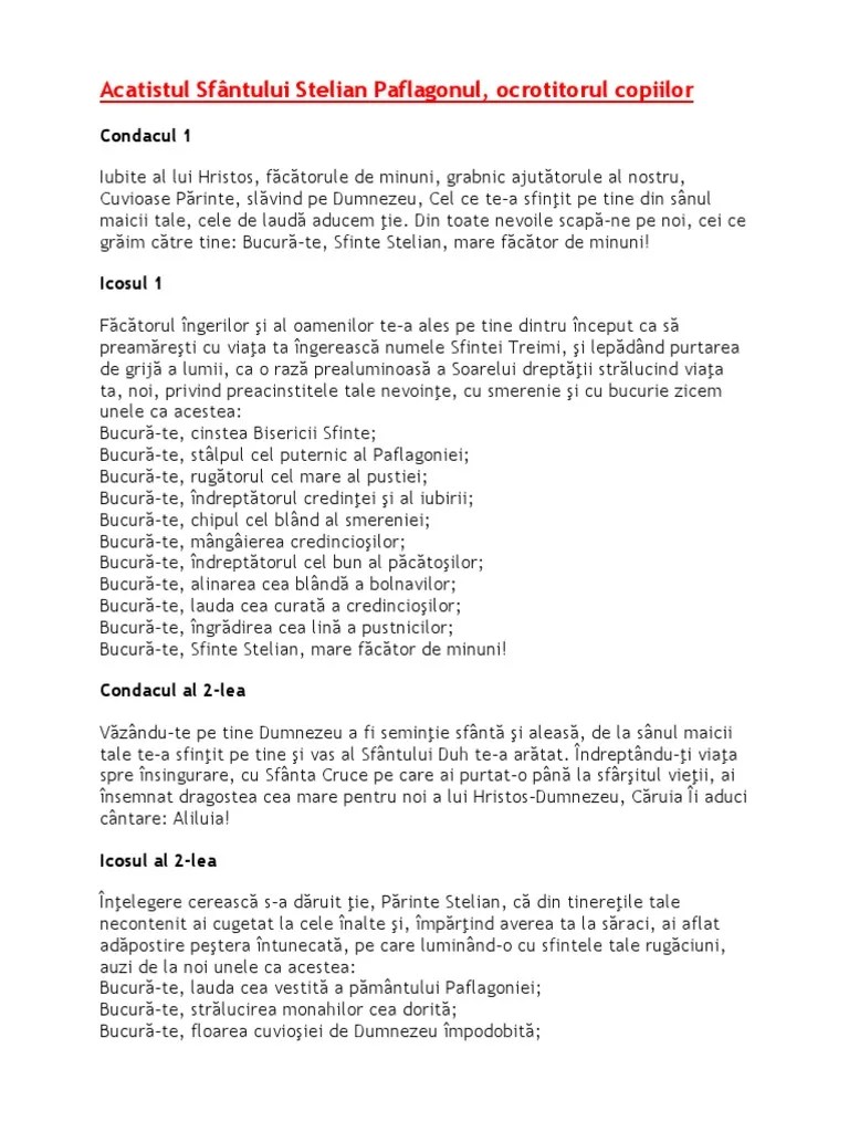Acum, în slava cerească vieţuind şi înaintea împăratului hristos stând, nu uita pe credincioşii care cu. Slavă ție, dumnezeul nostru, slavă ție... Rugăciune către sfântul cuvios stelian paflagonul, ocrotitorul pruncilor.