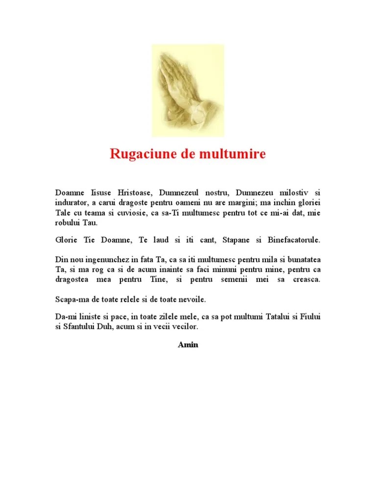 Îţi mulţumesc măicuţă pentru toate comunicările tale sfinte, pentru sănătate, pentru ajutor, pentru grija ta de. Preasfântă fecioară, preacurată maică născătoare de dumnezeu, îţi mulţumesc că ne eşti şi nouă mamă bună, iubitoare şi grabnic ajutătoare! Slava tatalui si fiului si sfantului duh, si acum si pururea si in vecii vecilor. Dec 21, 2018 · rugăciune de mulţumire către maica domnului. Rugăciune către mântuitorul iisus hristos pentru ieşirea din necazuri. Doamne, iisuse hristoase, dumnezeul nostru, dumnezeule a toata milostivirea si indurarea, care ai nemasurata mila, nespusa si neajunsa iubire de oameni, cazand acum catre a ta slava cu frica si … Îţi mulţumesc măicuţă pentru toate comunicările tale sfinte, pentru sănătate, pentru ajutor, pentru grija ta de. Dec 16, 2019 · rugaciune de multumire catre dumnezeu. May 21, 2012 · rugaciune pentru binefacerile primite de la dumnezeu. Rugăciune de mulțumire pentru binefacerile primite de la dumnezeu doamne, iisuse hristoase, dumnezeul nostru, dumnezeule a toată milostivirea și îndurarea, care ai …. Slava tatalui si fiului si sfantului duh, si acum si pururea si in vecii vecilor.